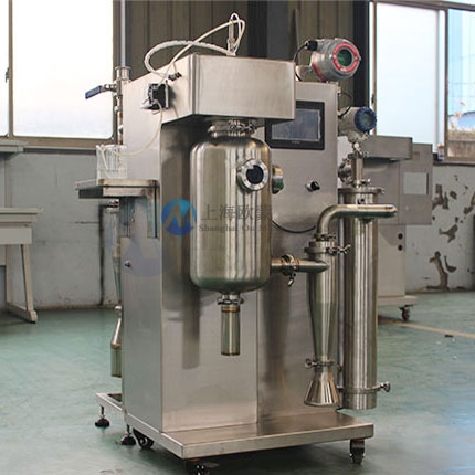 首先在開啟風(fēng)機(jī),加熱模塊,干燥塔體內(nèi)充入氮?dú)猓桓稍锏囊簯B(tài)物料經(jīng)輸液泵輸送至噴頭處,液態(tài)物料被霧化器霧化成細(xì)小液滴,液滴在干燥塔內(nèi)與熱氮?dú)膺M(jìn)行充分的熱交換,物料中的液態(tài)部分被瞬間蒸發(fā),固態(tài)部分形成的粉狀物料沉于塔底,*后經(jīng)過(guò)旋風(fēng)分離器進(jìn)行氣固分離至物料收集瓶,溶劑經(jīng)過(guò)冷凝器回收,氣體循環(huán)利用。